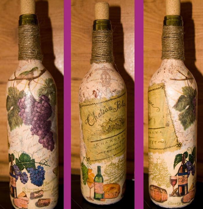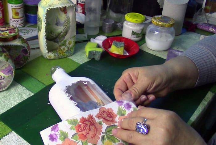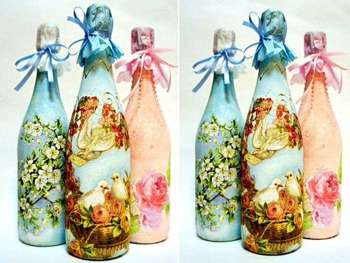 Decoupage patterns are also applied to glass bottles. More often than not, the work is amazing - a simple bottle turns into a work of art!