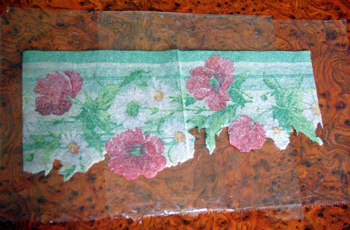The object is washed out, degreased, primed and varnished. As soon as the varnish layer dries, you need to work a little with sandpaper. After that, they already go directly to gluing the napkin or part of it. The dried image is varnished with several layers.