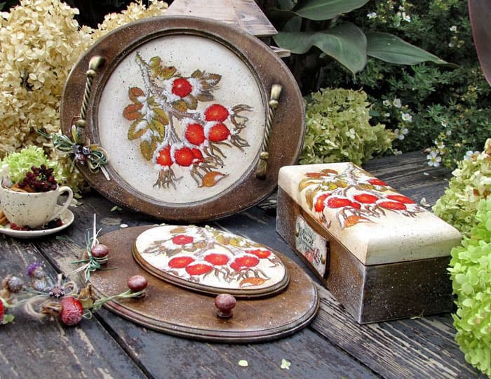 You can create something beautiful on any surface of any object. Do you have an old kettle that you plan to add to the decor? Excellent, the metal is also subject to decoupage processing. An old book, tables and chairs, chests of drawers, glass, wooden products - decoupage can be used everywhere.