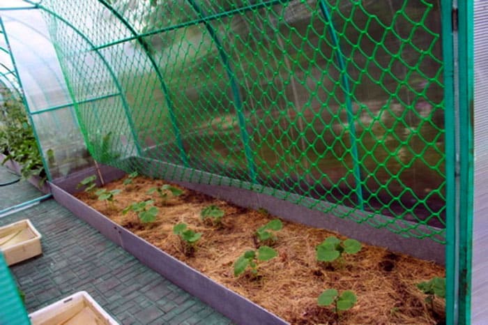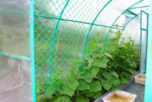 Supports for trellises in the greenhouse are installed only after transplanting, when it has already taken root. They need to be dug in on the sides to a depth of 30-50 cm and stretch the net. For fastening to a tree, use a stapler, to metal - clamps or wire. You can additionally tie the mesh to the greenhouse frame.
