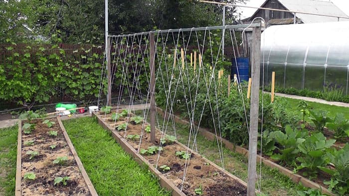 A rectangular trellis is the simplest support for open field cucumbers. For her, you only need 2-3 bars, which need to be installed on the sides of the garden, then you can pull the twine. The more often the threads are located, the easier it is for the cucumbers to braid the props.