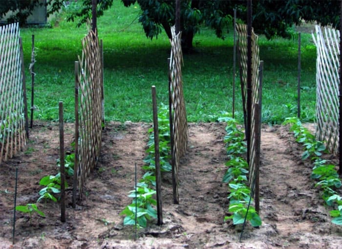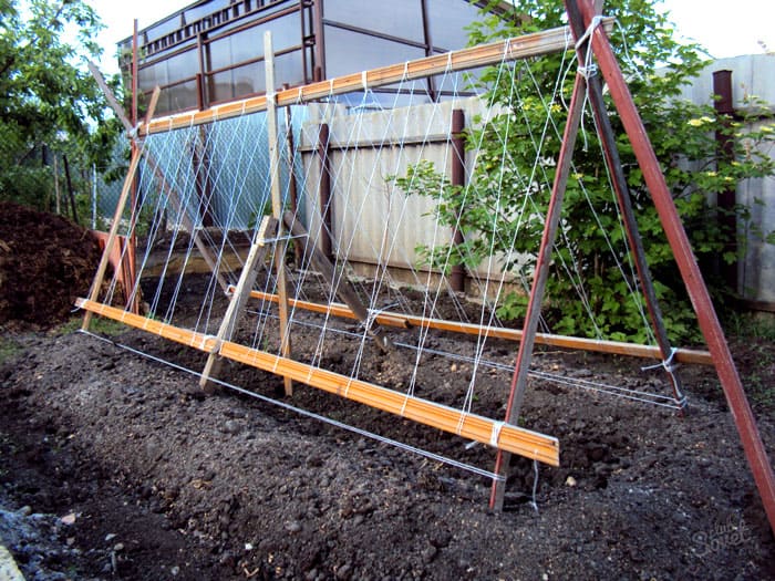 Any form of trellis is suitable for open ground. If this is a vertical structure, you will first need to drive the support beams into the ground to a depth of 50 cm. A support in the form of a hut will allow you to simultaneously fix the mesh on both sides. This is a more sustainable and practical option for a small area.