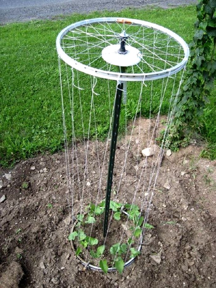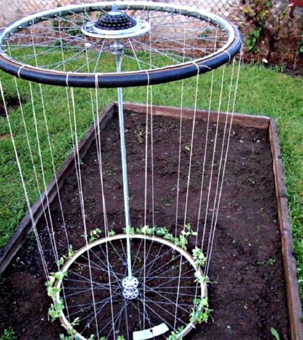 A simple and unusual vegetable support can be made from bicycle wheels. This is an excellent solution for amateur gardeners to increase yields in a small area. To erect such a trellis, you only need two rims without spokes, a steel bar, wire and twine.
