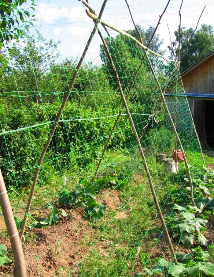 The trade network sells a special net for garter cucumbers, it can be plastic and trellis, often metal is also used. It can be stretched both vertically and horizontally. It is advisable to purchase a fine-mesh product, so it will be easier for the tendrils of the vines to catch on.