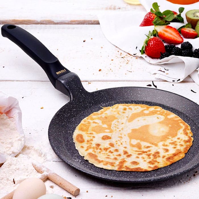 The pancake pan is made of aluminum and the coating is made of marble chips. Due to the rough surface, oil is almost not required, and what is poured in small quantities is evenly distributed.