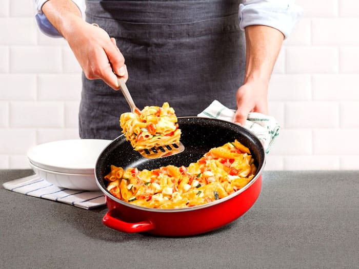 Stir food in it with a spatula or a spoon: the coating is very resistant to mechanical damage. The handles are solid, and the volume of the pan is 4.6 liters.