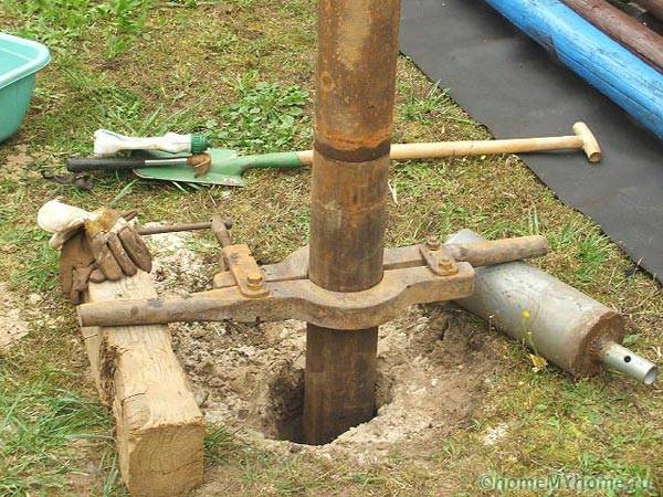 On dense soils, after impact, the pipe additionally rotates with levers welded or passed through the holes. This allows you to increase productivity, reduce labor costs.