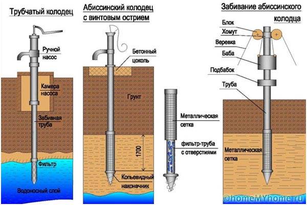 The most economical method is the Abyssinian well, from which no soil is extracted at all. The soil is compacted when the growing pipes are clogged, the column becomes operational, through it water enters the pressure line.