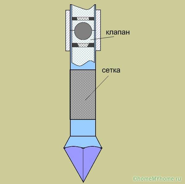- casing - usually made of polyethylene pipes, in the lower part it is perforated with slots or round holes, or a factory, home-made filter is attached to the bottom;