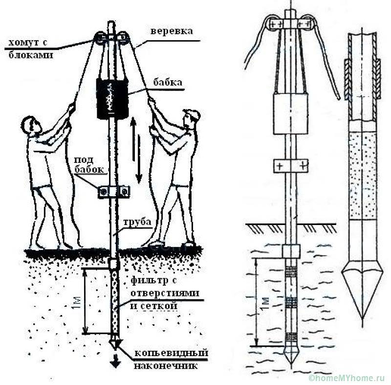 There is a method of building a source of water intake without excavation. The hole in the ground is made by compacting the adjacent rocks by driving a small diameter pipe. That is, the working tool after reaching the aquifer simply becomes a casing string.