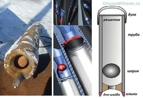 The bailer is made from a pipe, the lower edge of which is sharpened (chamfer) or has teeth for breaking the formation. A round plug is installed inside the hinge to the size of the inner diameter of the pipe. When hitting the ground, the plug opens on a hinge, when removed, it closes under the weight of the soil that has accumulated inside.