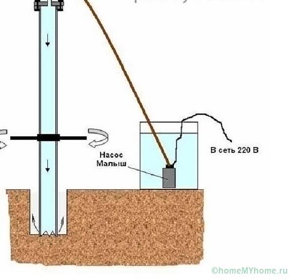 Useful advice! As soon as the drill reaches the aquifer, the soil ceases to linger on the auger, blades. Further drilling is carried out by flushing, for which water is supplied to the bottomhole under pressure.
