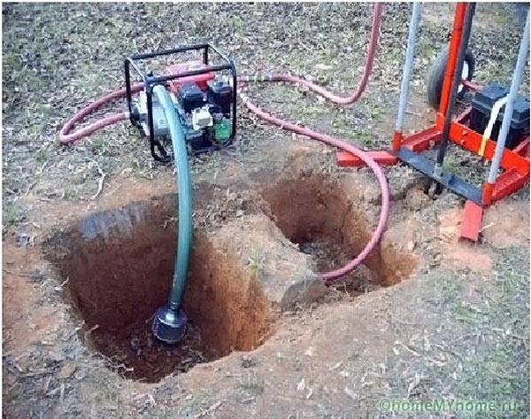 Then a thief is installed in the pit, and water is supplied from the reservoir under pressure. The liquid erodes the rock, the drilling fluid is discharged by a mud pump into a container or flows into a pit along a dug trench for settling, re-sampling, and repeating the cycle.