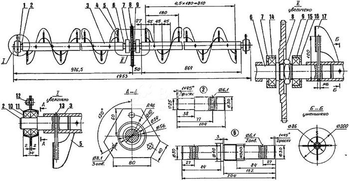An important part of the snow blower is the auger. These are blade rings attached to the drive shaft. A pipe 80 cm long is suitable as a shaft. In the center, you need to cut a hole where a shovel will be placed for feeding snow. The snow is reclined thanks to the rotation of this pipe.