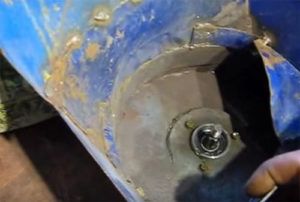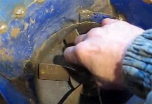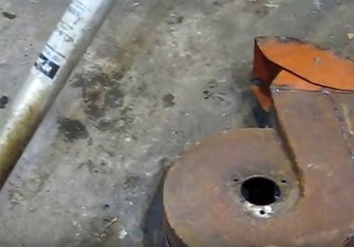 - the body is made of a metal barrel, which is cut at a distance of 15 cm from the bottom. A hole is made in the center where the protruding gearbox will be placed;
