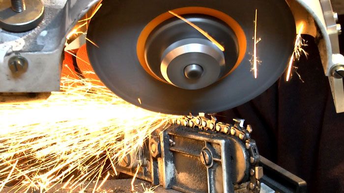 Usually, an abrasive wheel is used as a sharpening element, through which chainsaw chains are sharpened.