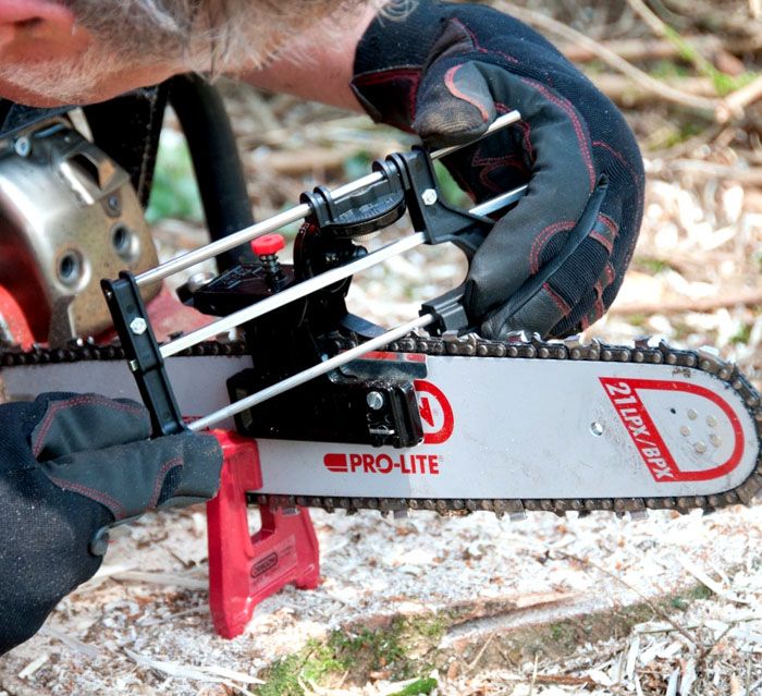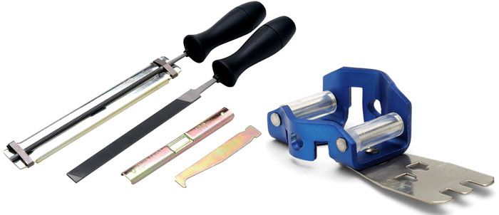 Using a file, you can sharpen the chain without the use of other devices or with their use to facilitate this process.As additional devices that provide the required angle of sharpening of the cutting edges, hand-held mobile machines that are not equipped with an electric drive are used.Files used for manual sharpening of chainsaw chains are sold in special sets designed for this purpose.