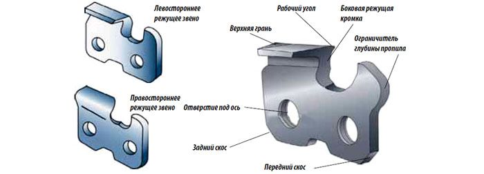 The saw chain tooth has a complex geometric shape and is equipped with two cutting edges, one of which is responsible for making an incision on a wooden surface, and the other removes chips from the sawing site and ensures its width.