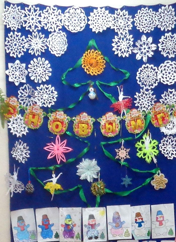 Can't draw? And don't! We cut out snowflakes, prepare the best photos, draw a Christmas tree in the center from a ribbon or paper and voila - it's done!