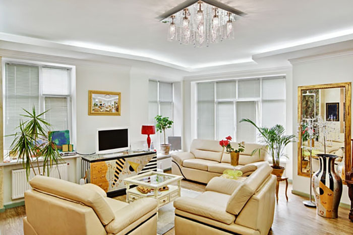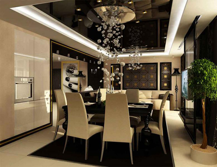 For the art deco style, modern multilevel stretch ceilingsdo stucco surfaces, recessed lighting in the ceiling.