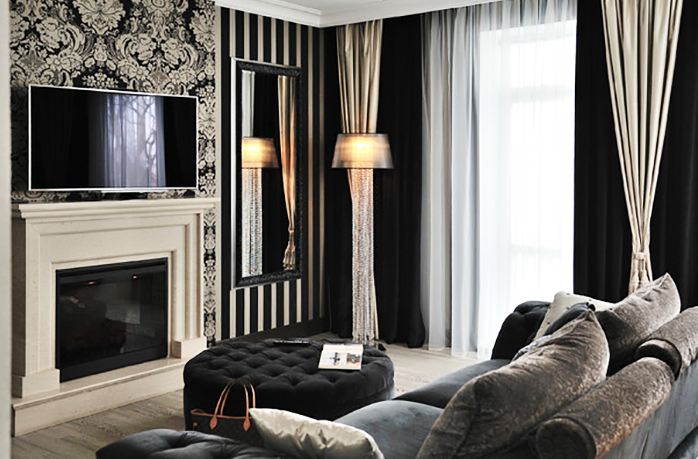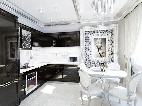The interior must have beautiful sconces, floor lamps that will create a play of light and glare on the gloss, this, together with mirrors, will help create an exquisite interior.