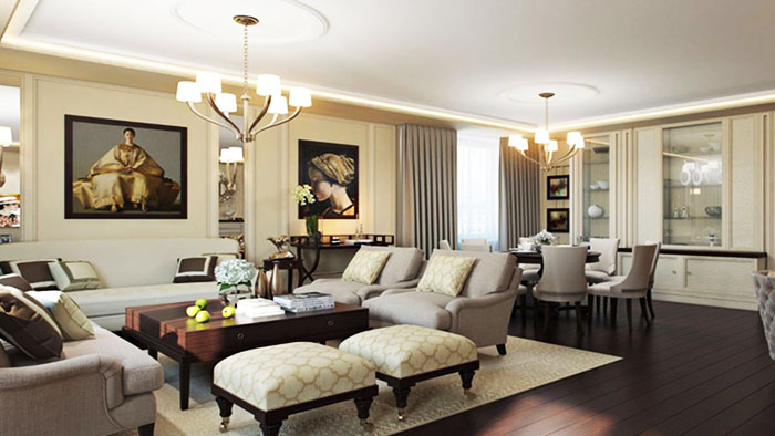 The floor should have a gloss and shine, therefore they choose parquet, large tiles and marble.