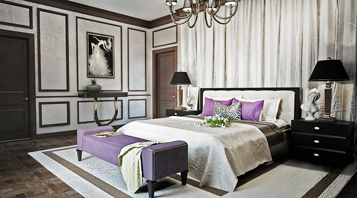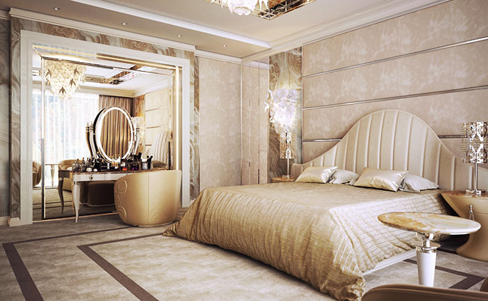 Luxurious style furniture has simple and luxurious shapes. Bed in the bedroom - always the central object, often it stands on chrome-plated legs, has inlay and patina.
