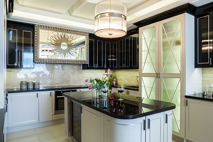 Refinement is created by ceramic in gloss, a combination of colors inherent in the style. It needs marble, glass and metal.