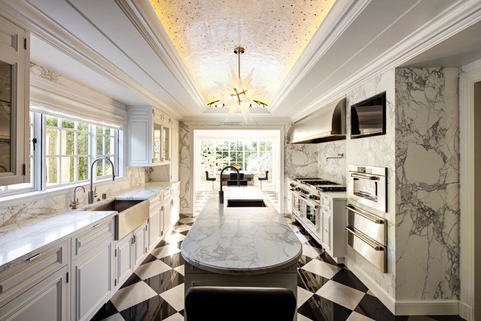 A chic chandelier always hangs from the top center, taking the base in a patterned or shiny round rosette
