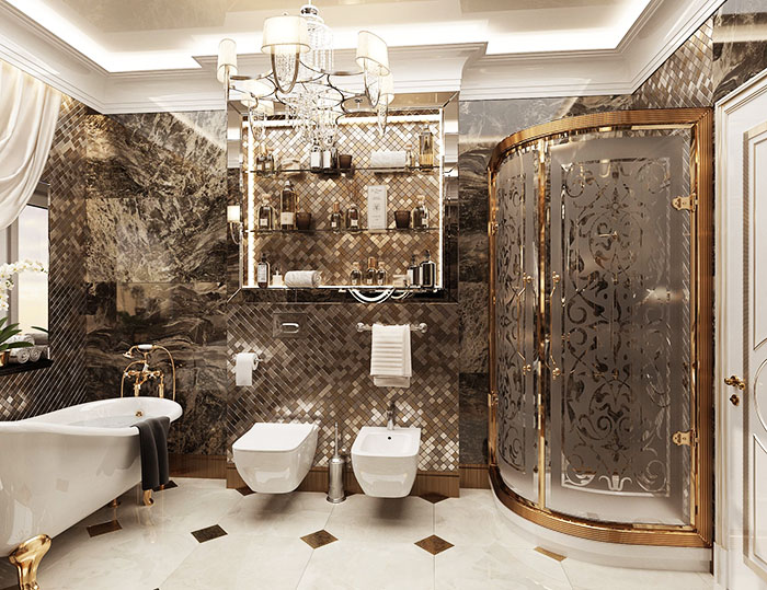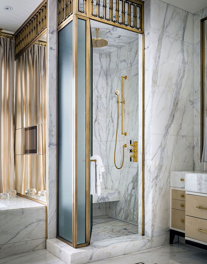 The shower stall should showcase richness and sophisticated taste through gilding and marble
