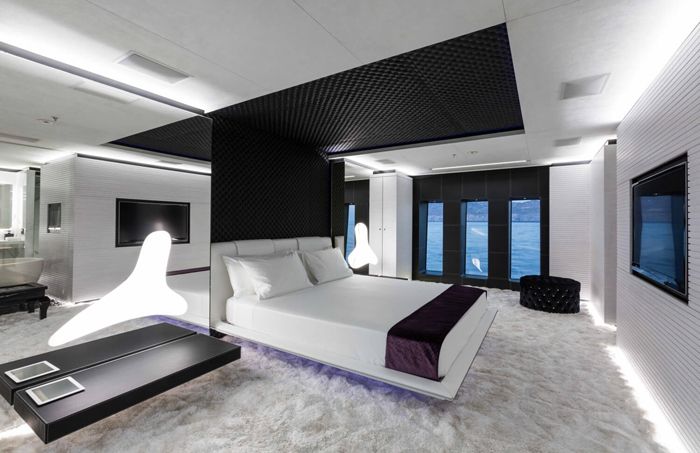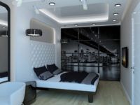 When arranging a bed, high-tech is softened, diluting with characteristic elements of other styles. These can be pillows, curtains, a soft rug at the foot of the bed, or elegant bedside lamps that emit warm light. The presence of a large number of modern technology and automated systems (automatic sliding curtains, "smart" alarm clock on the bedside table, etc.) and the correct forms remain unchanged attributes of a high-tech bedroom interior (photo examples are presented below).
