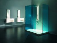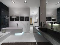 A high-tech bathroom looks incredibly elegant. Light from a variety of spotlights will reflect in metal elements, on glossy surfaces, glitter in the water. Bathtubs are finished with plain tiles, snow-white sanitary ware with ultra-modern accessories and a large number of glass elements.