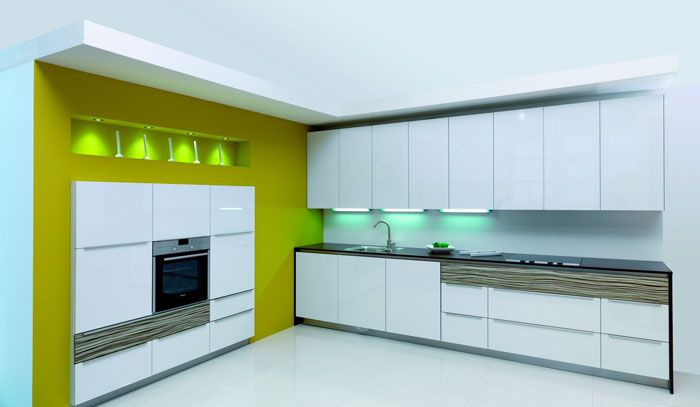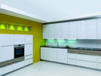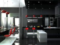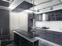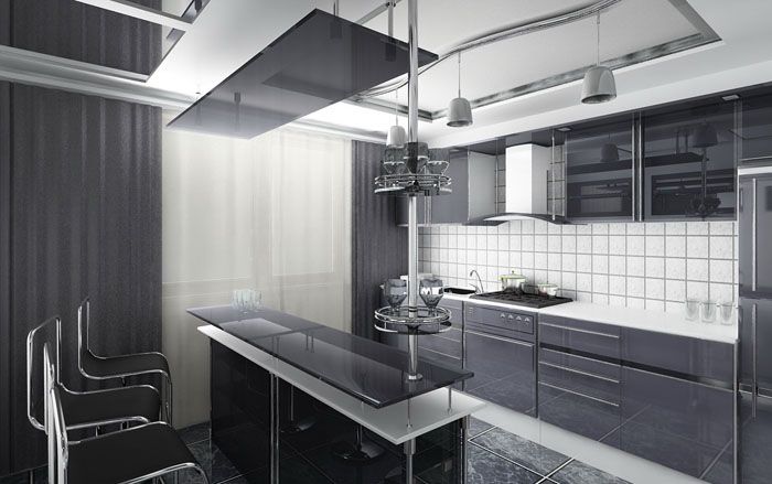 As for the finish, in this case, the characteristic features of high-tech will be on hand to the designer. The floor is finished with glossy tiles; practical paint or plastic panels are chosen for the walls. Kitchen sets are made of plastic, which is often framed in an aluminum frame. For the countertop and apron, durable glass or plastic of the latest generation is suitable.