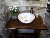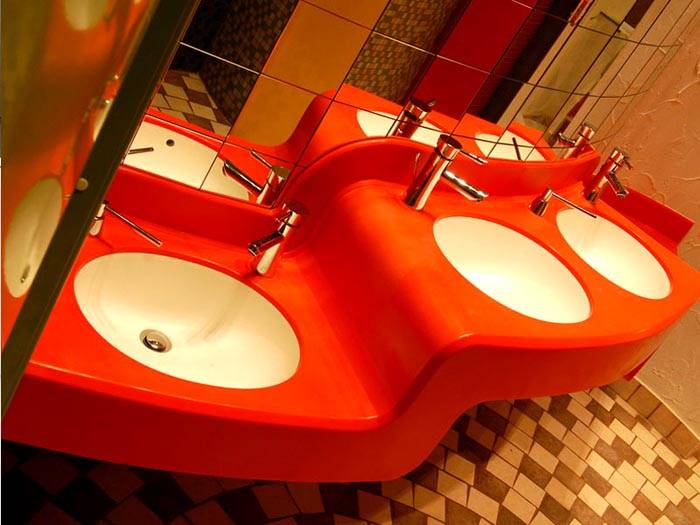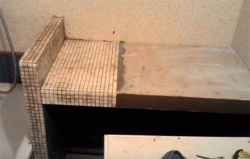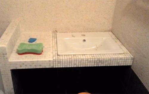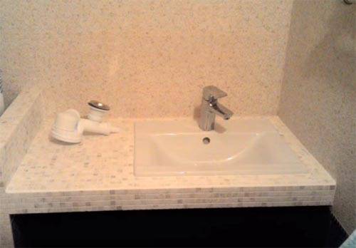Countertops with a countertop washbasin can be made from drywall moisture resistant, lay out bricks... There are many options for execution. The surfaces are painted with water-based paints or finished with mosaic tiles. Sinks in the bathroom overhead on the countertops can be made of faience, metal, glass or stone.