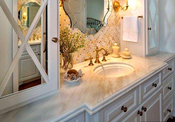 The use of marble countertops under the bathroom sink is the choice of sophisticated owners. This is a rather expensive high quality product. Marble is mined in different parts of the world, and therefore natural patterns are diverse.