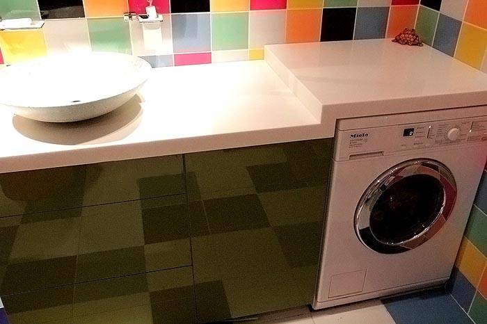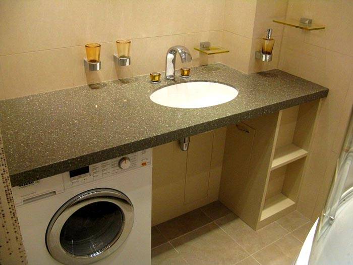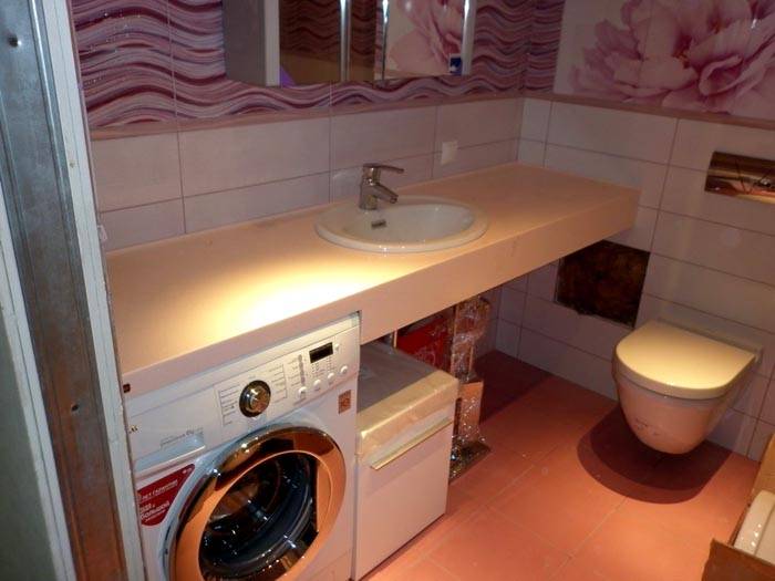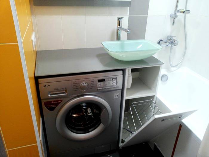 Small squares require an integrated approach with which you can free up bathroom space. Manufacturers' suggestions for installation washing machine and sinks under the same countertop were well received by consumers.This performance model has both positive and negative sides. Before choosing, you must familiarize yourself with all the nuances of the process.