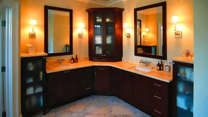 If geometry permits, you can choose a corner cabinet for a countertop washbasin.A bowl in this design will be located close to the corner. For a corner structure, you can also install a conventional washbasin.