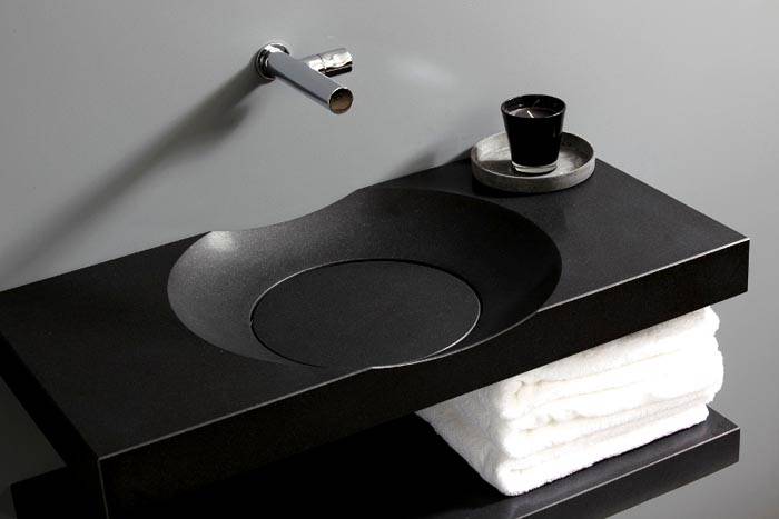 It will be interesting to look at the dark surface of the countertop with a white faience washbasin. Using frosted or clear glass for the countertop washbasin will add an airy feel to the room. The washbasin of the correct geometry will add laconicism to the interior.