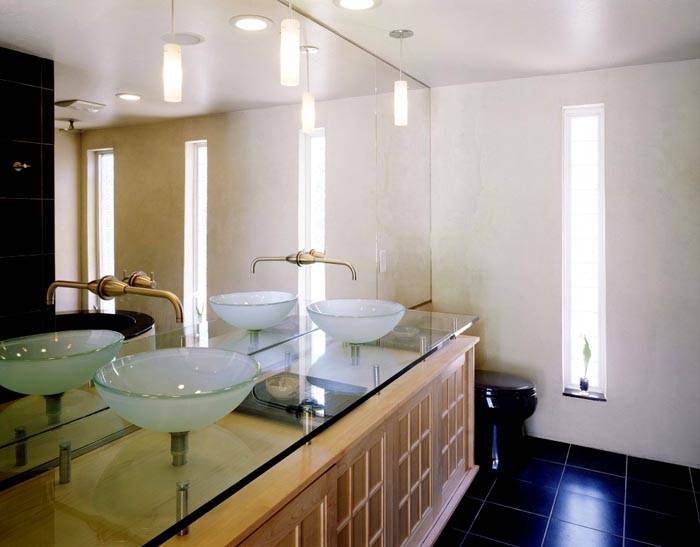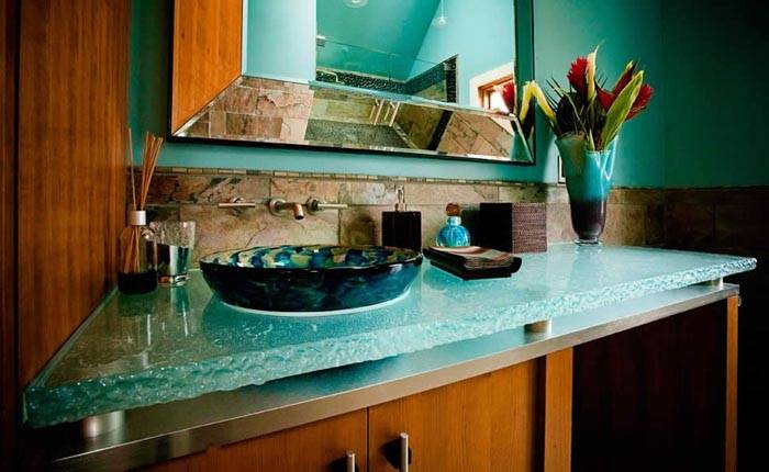 The use of glass countertops for the bathroom is quite popular due to its low cost. Its production does not require the use of a complex technological process.