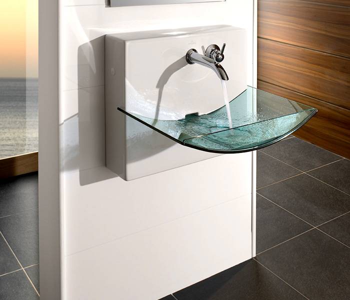 - the glass bowl sink is sturdy enough. Special hardened glass is used for its manufacture. She is not afraid of mechanical stress. The disadvantage for such a product is the deposition of limescale;