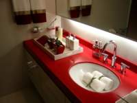 The bathroom countertop made of artificial stone is visually similar to natural. It is made of marble chips. There are also models made of granite particles. Acrylic acts as a connecting link. Their second name is acrylic countertops. They have almost all the properties of natural products. The upside is their affordable cost.