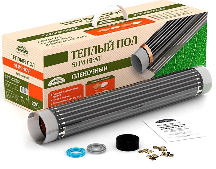 The principle of operation is similar to that of an infrared heater. There is a heating element between the layers, and the back of the film is covered with a thin layer of aluminum. When heated, infrared radiation is generated, which affects objects without increasing the temperature of the air in the room. If linoleum, parquet or laminate is laid on top of such a film, then it warms up, and it becomes pleasant to step on such a floor even with bare feet. The floor gives off heat to the surrounding air, thereby warming up the room.