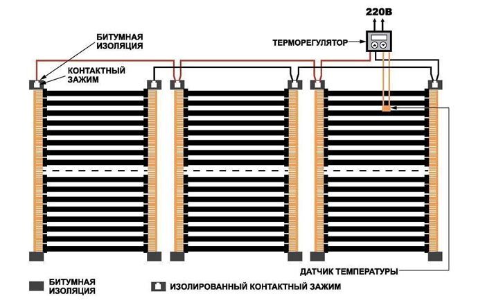 From the step-by-step instructions, we learned how the wiring is connected to the heating elements. Then the cable goes to the thermostat, where the temperature sensor is also connected. Nothing complicated.