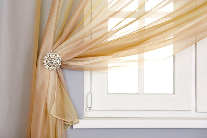 One of the most common fabrics that are used at home for sewing curtains is a veil. This material has a translucent texture that lends itself to creating various designs. The surface of the fabric is matte, so there are traces of wet spots on it.