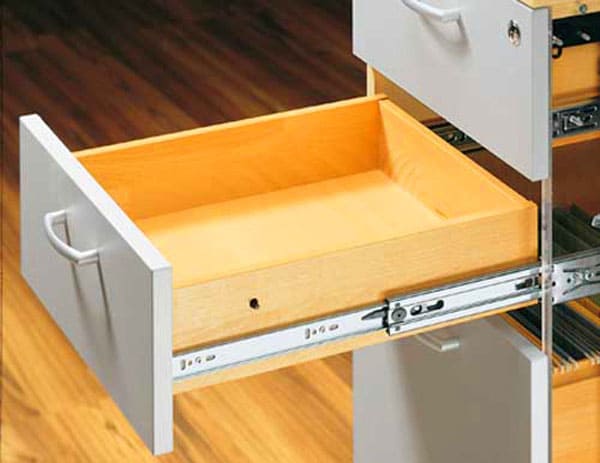 The keyboard shelf that slides out from under the table top requires rails. Often in inexpensive models, a roller guide mechanism is used, although a ball bearing is more reliable and of high quality.
