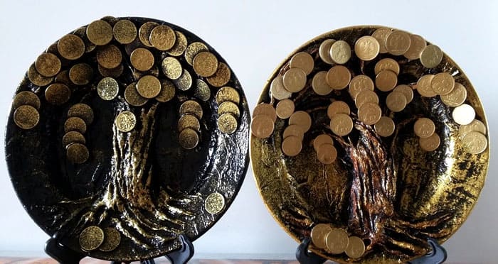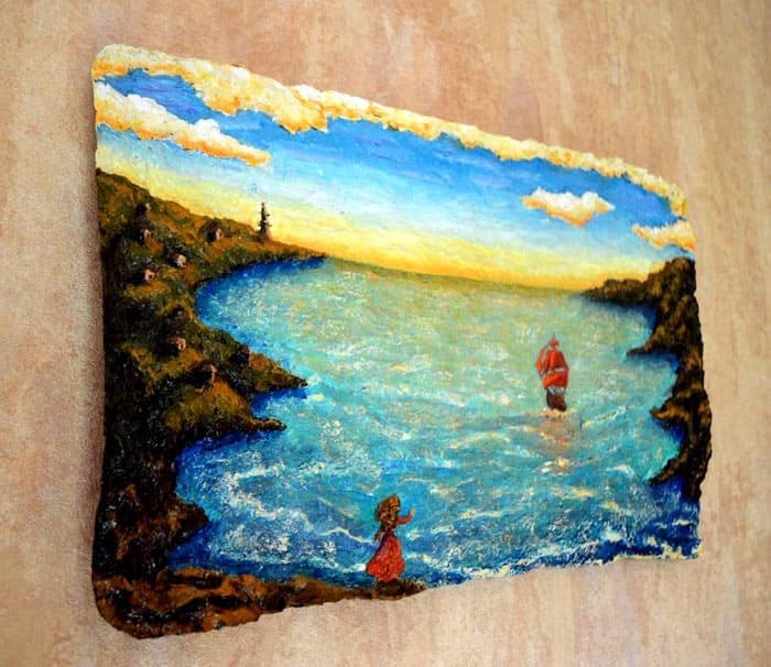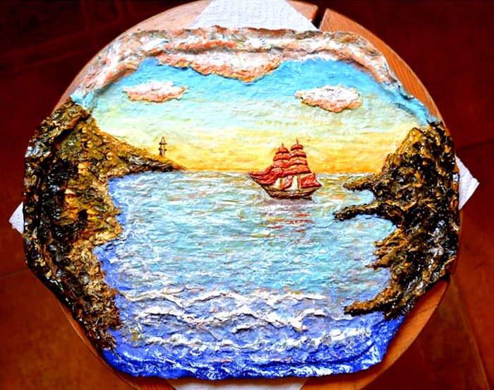 ¡Consejo! Puedes pegar algunos elementos encima de los esculpidos. Pueden ser ramitas adicionales, hojas, elementos de flores, balcones, si está dibujando una casa. Se pintan por separado, se esperan a que se sequen, se recortan y, con pegamento, se pegan a la imagen.