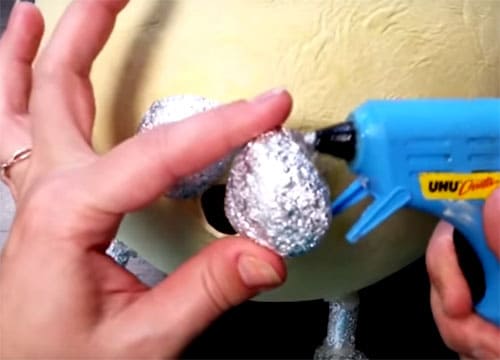 - Remoja pedazos de servilletas en un bol con pegamento. Colocan los objetos que se muestran en la imagen. Ayudamos a formar lo deseado con un pincel y herramientas improvisadas.