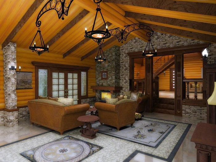 En el interior de una casa hecha de troncos redondeados, es apropiado utilizar piedra natural con un acabado rugoso.