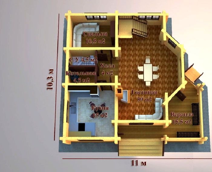 Una ventaja adicional de este proyecto de casa de un piso es su bajo peso, lo que reduce la carga sobre los cimientos. Para una instalación precisa, utilice un conjunto de espacios en blanco, dibujos de montaje.