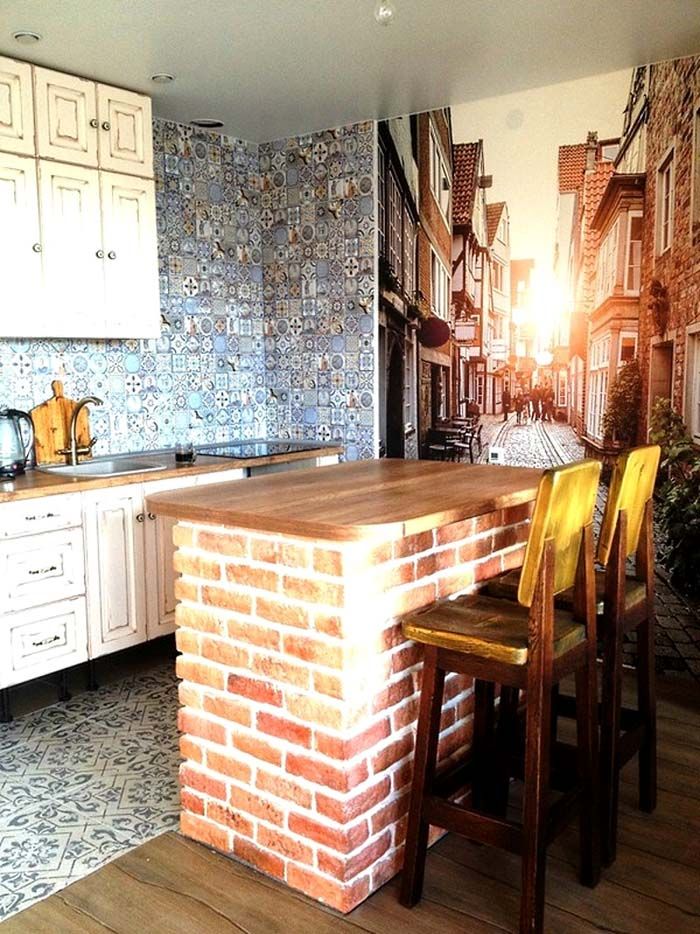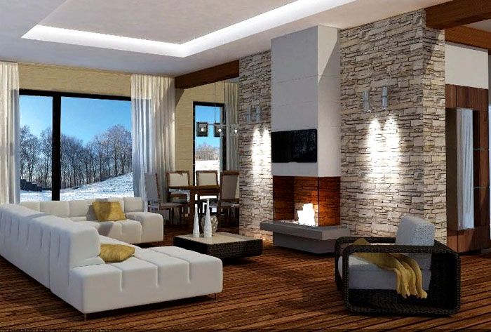 Los elementos de acabado de estilo rústico son visibles no solo en la fachada, sino también en otras partes del proyecto.